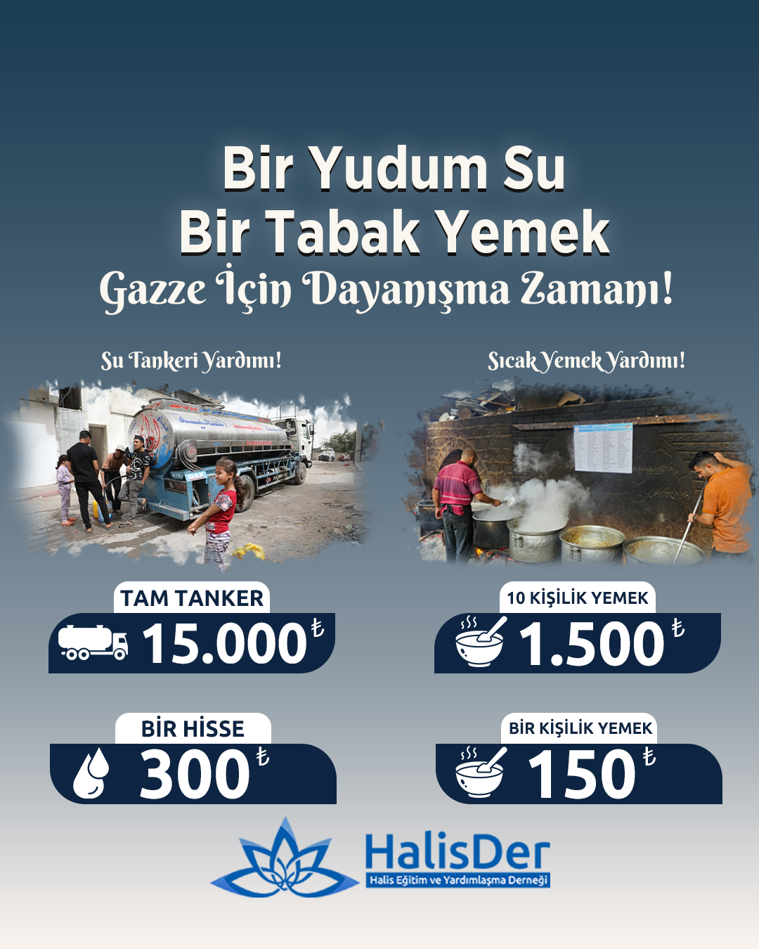 Yıllardır abluka altında yaşayan Filistinli kardeşlerimiz, özellikle Gazze Şeridi'nde temel ihtiyaçlara ulaşmakta büyük zorluklar yaşıyor. Elektrik, su ve gıda gibi en temel insani ihtiyaçların dahi karşılanamadığı bu bölgede, her yardım hayata tutunmak için bir umut oluyor. Halis Derneği olarak bizler de bu umudu yaşatmak için, Türkiye’den Filistin’e erzak yardımları gönderiyor; açlık ve yoksullukla mücadele eden kardeşlerimizin yanında olmaya devam ediyoruz.